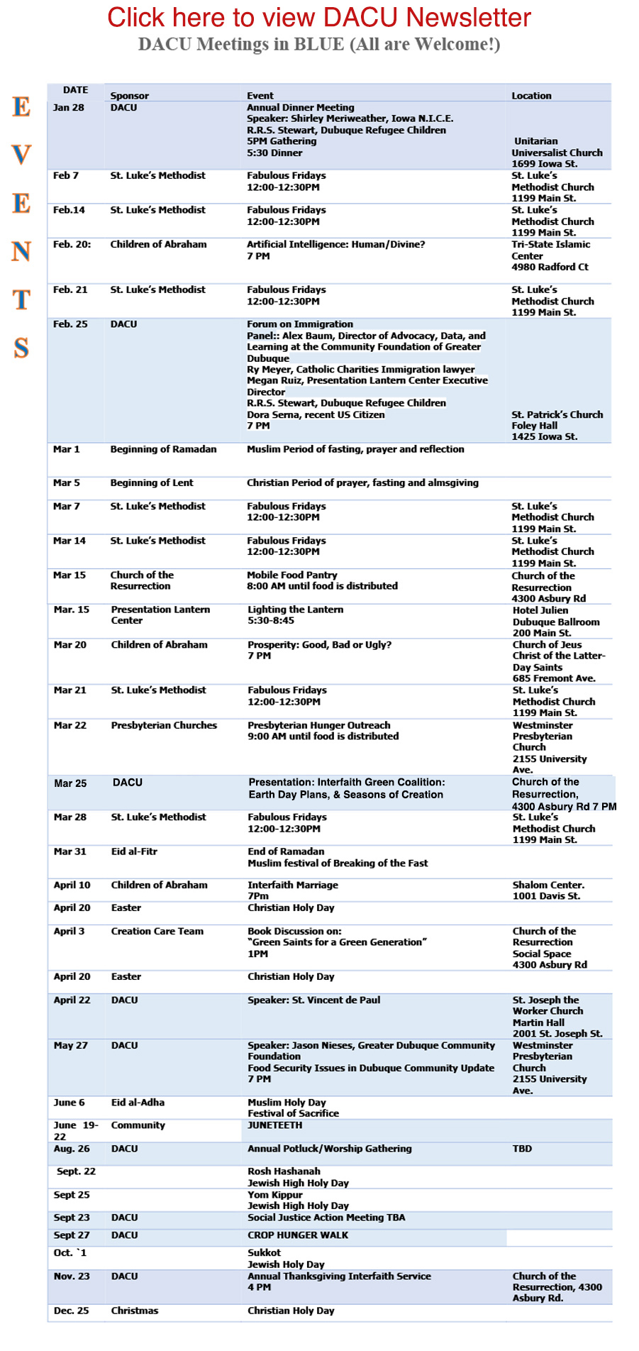 CLICK HERE TO VIEW OUR 2018-2019 BROCHURE. Dubuque Area Congregations United (DACU) welcomes you and invites you to make worship a part of your visit to our community.
